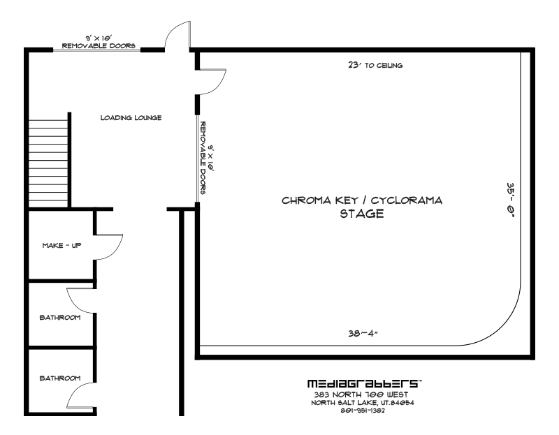 The MG Studio is a 35′W x 38′D x 23’H sound insulated film stage with a pre-lit 2 wall paintable Chroma Key / Cyclorama for rent in North Salt Lake, Utah. The climate controlled stage comes with a basic lighting package and access to additional facilities.